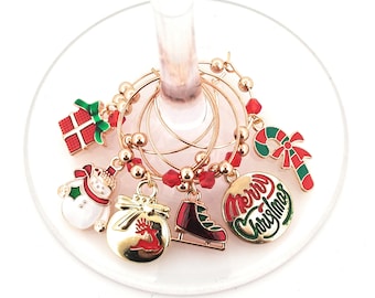 Christmas Wine Charms - Gold Christmas - 8 pack - Party Favor Packaging Option Available