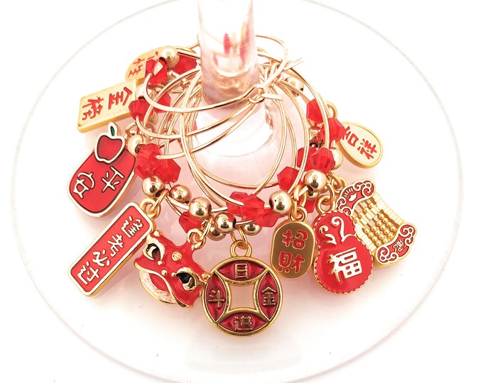 Chinese New Year Wine Charms – Festival Enamel Designs with Lucky Lanterns, Bring in the Lunar New Year, Glass Markers, Party Supplies, Gift